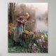 Este diseño presenta un cuadro del artista estadounidense Daniel Ridgway Knight (1839-1924). Muestra a una hermosa joven sosteniendo una barra de pesca de madera en su mano. Ella se está asomando al río para ver si ha pescado. Hay flores florecientes en colores brillantes a su alrededor. También hay algunos peces por sus pies que ya ha pescado. Es una atractiva escena de la vida tradicional y de la pesca de cosecha.