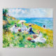 Un cuadro impresionista de una familia que disfruta de un picnic junto al mar. El exuberante prado verde, la brisa del océano y la suave luz del sol crean una escena exterior serena.