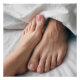 Se ve el pie de una mujer y el de un hombre tocándose en una cama, parcialmente cubierta por sábanas blandas y blancas