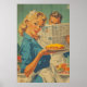 Una alegre ama de casa de los años 50 presenta un delicioso pastel mientras su marido lee el periódico, capturando la clásica Americana de mediados de siglo con vibrante encanto vintage. Ideal para tarjetas de felicitación nostálgicas.