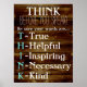 Piense antes de hablar, asegúrese de que sus palabras son verdaderas, útiles, inspiradoras, necesarias y amables. Una motivación y un inspirador acrónimo poster en clase para recordarles a los estudiantes ser respetuosos y reflexivos. Fondo del tablero de carteles de madera con letras blancas antiguas frescas.