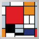 Este aceite sobre lienzo de 1920 muestra una composición con bloques negros, rojos, grises, amarillos (naranjas) y azules en un estilo que llegó a conocerse como De Stijl o Neoplasticismo.