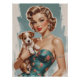 Entrar en el mundo del glamour vintage con este encantador ilustracion de un alfiler rubio, ¡acariciando un adorable cachorro marrón y blanco! Su verde azulado vestido, adornado con un delicado patrón floral, se empareja maravillosamente con su peinado retro, joyas de perlas brillantes y un fondo verde azulado texturizado. Esta pieza capta la dulzura y elegancia del arte clásico con un toque lúdico.