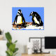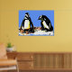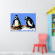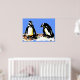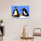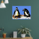 Este poster de arte pop cuenta con dos adorables pingüinos africanos en una cornisa rocosa. Son pájaros acuáticos y sin vuelo cuyas alas se han convertido en aletas. Cada una tiene una franja negra y manchas negras en el pecho. El patrón de puntos es único para cada pingüino, al igual que las huellas dactilares humanas. Tienen glándulas rosas sobre sus ojos y pies rosados y negros.