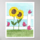 I love to draw imaginary birds and in this watercolor painting I put a little flock of little pink birds next to a couple of sunflowers. To inject some personality into the flock I have them all staring in amazement at those very big sunflowers