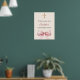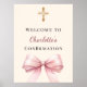 A large pink bow and a golden cross as decoration. A soft, blush ivory background. Personalize and add her name.