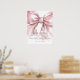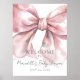 Pink Bow Baby Shower Welcome Sign. This elegant sign showcases an oversized pink watercolor bow spanning the top, creating a bold and charming focal point. Gray fonts in a mix of script and serif typography add a sophisticated touch.