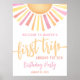 Welcome guests to your little one's First Trip Around The Sun 1st birthday party with this bright and cheerful sun-themed welcome sign! A large sun with vibrant rays in shades of yellow, orange, pink, and red sits at the top, setting the tone for a warm and joyful celebration. The phrase "First Trip Around The Sun" is displayed in a playful mix of modern fonts and bold script typography, adding a charming touch.