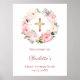A white background, decorated with watercolored pink and ivory flowers in a wreath and a golden cross. Personalize and add the name and date.