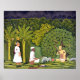 Disfrute de esta impresionante reproducción de la pintura india "Swami Haridasa con Tansen y Akbar en Vrindavana," de 1700 DC. Swami Haridasa, cantante y poeta de alto nivel, está sentado en su ermita en Vrindavana, llena de plantas verdes, árboles, arbustos floridos y lianas. Él tiene un tambura en las manos y está absorto en su música divina. Tansen, su discípulo, está sentado a una pequeña distancia frente a él. El emperador mogol Akbar se está escondiendo detrás de un bosque de plataneros. El espíritu del bosque, el misticismo, la paz y la serenidad de la escena se reflejan admirablemente en esta pintura. Las artes de la India restauran meticulosamente digitalmente esos tesoros para corregir el color descolorido, reparar el papel envejecido y restablecer la vibración. Busque en nuestra tienda esta imagen en diferentes orígenes de patrones o envíenos un mensaje con peticiones específicas.