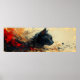 Pintura muy amplia y detallada del busto de un gato negro en un fondo abstracto de color amarillo polvoriento con acentos rojos y oxidados. Elaborado con algoritmos generativos y Photoshop.