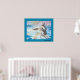 Un elegante y encantador cuadro de un caballo blanco en medio de las olas del mar en tonos azules con un cielo rosa. de mi colección de animales. Este poster tiene un marco azul.