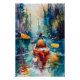Un ilustracion digital de una pintura acuarela de una persona remando un kayak en la naturaleza.