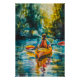 Un ilustracion digital de una pintura acuarela de una persona remando un kayak en la naturaleza.