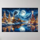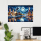 Bonita acuarela de una noche invernal con una locomotora de vapor vintage que llega a una estación adornada con luces de Navidad festivas. La nieve cubre el suelo y los tejados, y el telón de fondo presenta montañas impresionantes bajo un cielo estrellado con luna llena. El cálido resplandor del faro del tren y las luces intermitentes crean un ambiente de vacaciones acogedor, evocando sentimientos de nostalgia y celebración asociados con la temporada de Navidades.