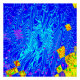 Este diseño presenta un fondo azul oscuro con remolinos azul claro y piezas amarillas sobre posters