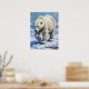 Esta imagen es una pintura texturizada de un oso polar caminando a través de un paisaje cubierto de nieve. La obra de arte tiene pinceladas gruesas y visibles en un estilo imperfecto, que le da a la piel del oso polar y a la nieve circundante un aire tridimensional. La paleta de colores es predominantemente blanca y de diferentes tonos azules, con sutiles toques de amarillo y naranja en la piel del oso.