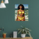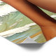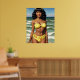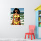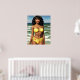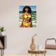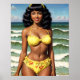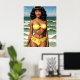 El poster cuenta con una vibrante obra de arte de estilo de retroceso de una impresionante modelo de mujer negra con un traje de baño floral amarillo. Vibes de época, pero un retrato de pintura moderno único de una bella belleza bikini de piel marrón que posa frente al océano. Estética de verano.