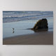imagen fotográfica a color de un Piper de arena en la playa sobre arena mojada y una gran roca en la playa
