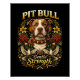 Una audaz ilustración ornamental de un pit bull rodeado de rosas y palomas, que simboliza la lealtad, la compasión y la fuerza incomprendida de la raza.