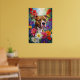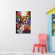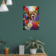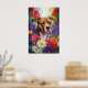 En un animado jardín de flores, un perro de pitbull blanco y marrón con una expresión seria. La cabeza y los hombros del perro son el punto focal, rodeados por una abundancia de flores coloridas. Las flores son una mezcla de amapolas rojas, margaritas amarillas y varios tonos rosas, violetas y azules. El fondo es una suave y borrosa acuarela de color azul y verde que da a entender un día soleado. Ideal para los amantes del pit bull.