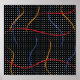 El retro de los años 1980, la pintura de color primario traza un patrón de salpicadura en un fondo geométrico con puntos en blanco y negro.