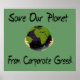El planeta Tierra está acunado en un par de manos amorosas con las palabras "Salvemos nuestro planeta de la codicia corporativa". Sin nuestra ayuda, el planeta será destruido por el cambio climático y el calentamiento global provocados por el egoísmo de la avaricia corporativa.