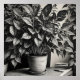 Planta de cacerolas de escala de grises con hojas enormes sobre un dibujo de mesa.