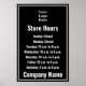 Puede reemplazar la imagen de visualización en la parte superior por el logotipo de su empresa. Bajo su logotipo, hay un texto en blanco que puede editar para escribir un mensaje personalizado y su horario de trabajo diario de domingo a sábado. En la parte inferior, hay un texto blanco para mostrar el nombre de su empresa. El poster es negro y tiene un sencillo borde blanco. El texto es blanco.