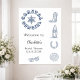 Un fondo blanco moda. Decorado con iconos azules de la playa chica de vaca. Personaliza y agrega el nombre de la novia. Texto: Vaquera costera.