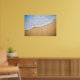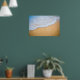 Poster con una fotografía de una playa de arena dorada marrón y surf de espuma blanca.