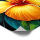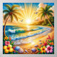 Luminosa playa tropical con un intenso amanecer, olas turquesas y flores vibrantes bajo palmeras que se balancean, creando un paradisíaco tranquilo y dinámico.
