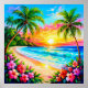 Una orilla tropical vibrante con una impresionante puesta de sol, olas turquesas y flores exuberantes en colores vivos. Perfecto para evocar la relajación, las vacaciones de verano y la serena belleza natural.