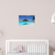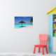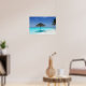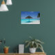 Un poster con una fotografía de una pintoresca playa tropical en Las Maldivas. Una playa de arena blanca y aguas cristalinas con un paraguas solo de paja. Escondido y sereno.