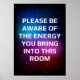 Motivational poster. Please be aware of the energy you bring into this room. Open space, starry sky style. Print design. Dark background