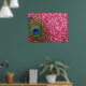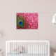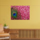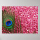 Fantástica foto de una perfecta pluma de pavo real con un fondo rosa rocoso y purpurinoso. Un regalo perfecto para el chica en su vida que ama el rosa