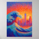 Colorful pointillist artwork of a dramatic ocean wave rising before the glowing New York skyline at sunset. Thousands of vibrant dots create a luminous neo-impressionist composition blending sea energy and urban architecture.