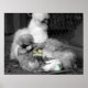 Esta fotografía fue alterada digitalmente, haciendo el fondo blanco y negro, pero dejando a las tres chicas de color. La foto es de dos gallinas de seda, una de ellas blanquecinas mientras se juntan mientras vigilan a su recién nacida familia de pollitas amarillas. Ansiosos de ver el mundo, dos bebés miran desde justo encima del ala de las madres marrones, otra chica se asoma detrás de la pierna de la madre. Una escena adorable. El Silkie (a veces escrito alternativamente Silky) es una raza de pollo llamada por su plumaje atípicamente esponjoso, que se dice que se siente como seda. La raza tiene varias otras cualidades inusuales, como piel y huesos negros, lóbulos azules y cinco dedos de los pies, mientras que la mayoría de los pollos sólo tienen cuatro. A menudo se exponen en espectáculos de aves de corral y aparecen en varios colores. Además de sus características físicas distintivas, los siquíes son bien conocidos por su temperamento tranquilo y amigable. Entre los más dóciles de las aves, los silquis se consideran un mascota ideal. Las gallinas también son excepcionalmente broódicas y hacen buenas madres. Aunque son unas capas justas, que ponen unos tres huevos a la semana, se usan comúnmente para incubar huevos de otras razas y especies de aves.