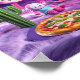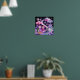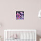 Este poster presenta una escena de fantasía caprichosa con una escalera de caracol de escalones blancos que suben sobre un fondo negro. La escalera está decorada con estrellas de plata colgante y nubes rosa y violeta de pom-pom. Una mecedora rosa se sienta en primer plano con una pequeña muñeca con un vestido azul claro y rosa. A la izquierda de la silla hay un gran reloj análogo rosa con números negros y manos. Un cactus verde con forma redonda se sienta delante del reloj. En la esquina inferior derecha se encuentra una almohada de tejido turquesa con un patrón de mosaico de cuadrados rosa, azul y amarillo. Un pequeño plato redondo con caramelos de colores se sienta en el suelo morado. Una pequeña muñeca de lavanda cuelga de una decoración de estrellas de plata. La escena está decorada con varios elementos violetas y rosados, entre ellos una gran nube rosa de pomelo con ojos de googly. La combinación de colores es rosa, violeta, plateada y negra, creando un ambiente mágico y de ensueño.