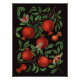 Ramas granadas con hojas exuberantes y frutos rojos ricos se extienden a través de un fondo negro. Una capa secundaria se desvanece sutilmente, añadiendo profundidad. Tradicionalmente pintados en papel con marcadores, los elementos son escaneados y compuestos en un patrón en Photoshop.