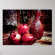 Plata de terracota sobre una mesa. Cuatro frutos rojos granados en bandeja. Un lanzador antiguo de barro cocido a la derecha de las granadas. Fondo oscuro. Un delicioso y saludable aperitivo de verano.
