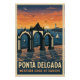 Poster de viajes retro vintage de Ponta Delgada, Azores, Portugal - la ciudad más occidental de Europa. Antecedentes: Puerta de Cidade (ciudad de piedra) con arquitectura portuguesa clásica