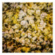 Vista macro de granos de palomitas calientes o granos de grano detrás del vidrio húmedo. Fotografía texturizada. No pierdas la oportunidad de ver la divertida camiseta que YO ESTÁ BIEN que representa un estómago lleno de palomitas de maíz.