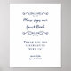 Elegante diseño de bienvenida para invitados a boda en azul y blanco con características de un clásico diseño formal tradicional atemporal. Dos florituras decorativas, cada una conteniendo un corazón, rodean bellamente el mensaje de texto "Por favor firme nuestro Libro de Invitados". Mantenga el mensaje de agradecimiento o personalícelo con sus propias palabras. Personalice la plantilla de muestra con sus detalles en letra romántica y escritura en azul marino. Para obtener resultados óptimos, reemplace nombres y fecha con los suyos dejando espacio como en el ejemplo y use mayúsculas donde se especifique. Envíe un correo electrónico a invitationsuites@gmail.com o use el botón de mensaje con preguntas o solicitudes de color personalizado.