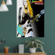 La imagen muestra a Orianthi, una música femenina, tocando una guitarra eléctrica. Se la representa de una manera estilizada, casi caricaturista, con su largo cabello rubio cayendo por su espalda. Lleva puesto un top negro y una falda corta, y su guitarra es de color azul claro con un cuerpo blanco