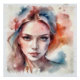 Style aquarelle représentant un portrait de Femme. Il s'agit d'un visage peint avec des couleurs douces et fluides qui se fondent les unes dans les autres. Les tons dominants sont des bleus, des rouges, des oranges et des tons chair, créant un effet éthéré et rêveur. Le portrait présente un regard intense et une expression contemplative. La technique utilisée donne une impression de délicatesse et de fluidité, typique de l'aquarelle contemporaine.