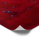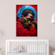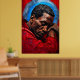 Dieses eindrucksvolle digitale Malerei Kunstwerk zeigt einen emotionalen Moment im Portrait eines Schwarzen Mannes, der seinen Kopf auf verschränkten Armen ruht. Gekleidet in ein tiefrotes Gewand, ist er von einem überwiegend roten Hintergrund umgeben, durchzogen von ausdrucksstarken blauen Farbspritzern.