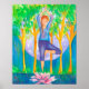 Poster bonito con una mujer tranquila en un árbol que posa una postura de yoga con una flor de loto rosa brillante en un estanque, árboles y una gran luna llena de color púrpura pintada con acuarela.