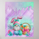 Gnome de conejo de Pascua con orejas conejitas rosas sentadas en flores de primavera con huevos decorados y una canasta de mimbre de zanahorias colocada sobre un fondo de manteca verde azulada y violeta de color azul con goteos de hielo de caramelo pastel.