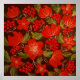 Un cuadro de estilo Petrykivka presenta flores y bayas rojas vibrantes, con motivos complicados y pinceladas delicadas. Las flores son grandes y simétricas, rodeadas de pequeños elementos florales y hojas ornamentales. Las bayas, probablemente racimos de viburno, se realzan con un detalle fino, dándoles un aspecto realista y a la vez decorativo. La composición está arreglada de manera tradicional ucraniana, mostrando contrastes brillantes y un armonioso balance de colores en un fondo blanco o claro. La obra de arte ejemplifica la elegancia y tradición folclórica de Petrykivka, celebrando la naturaleza y el patrimonio ucraniano.